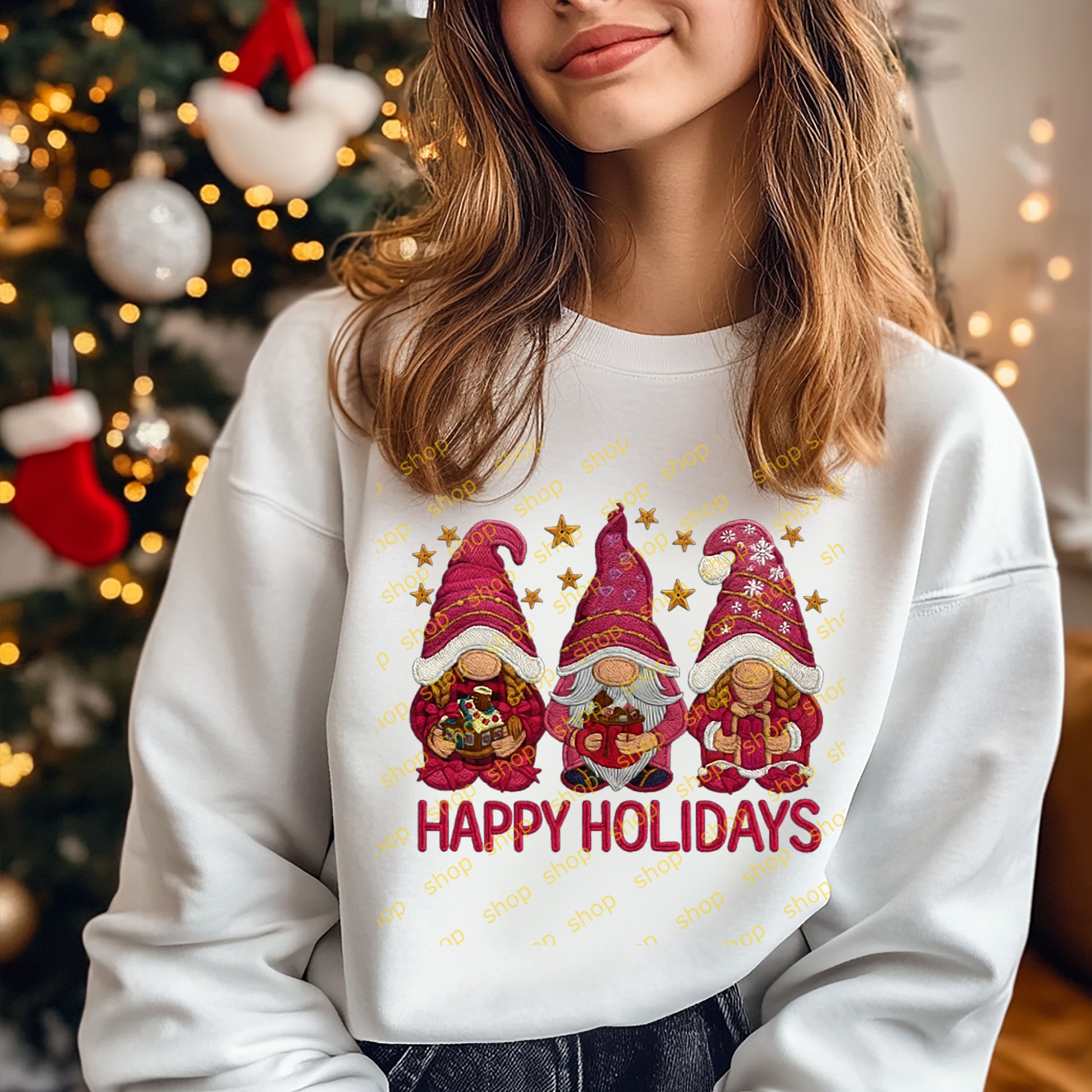 Happy Holiday Gnome Gilden 50% Cotten 50% Polyester true to size